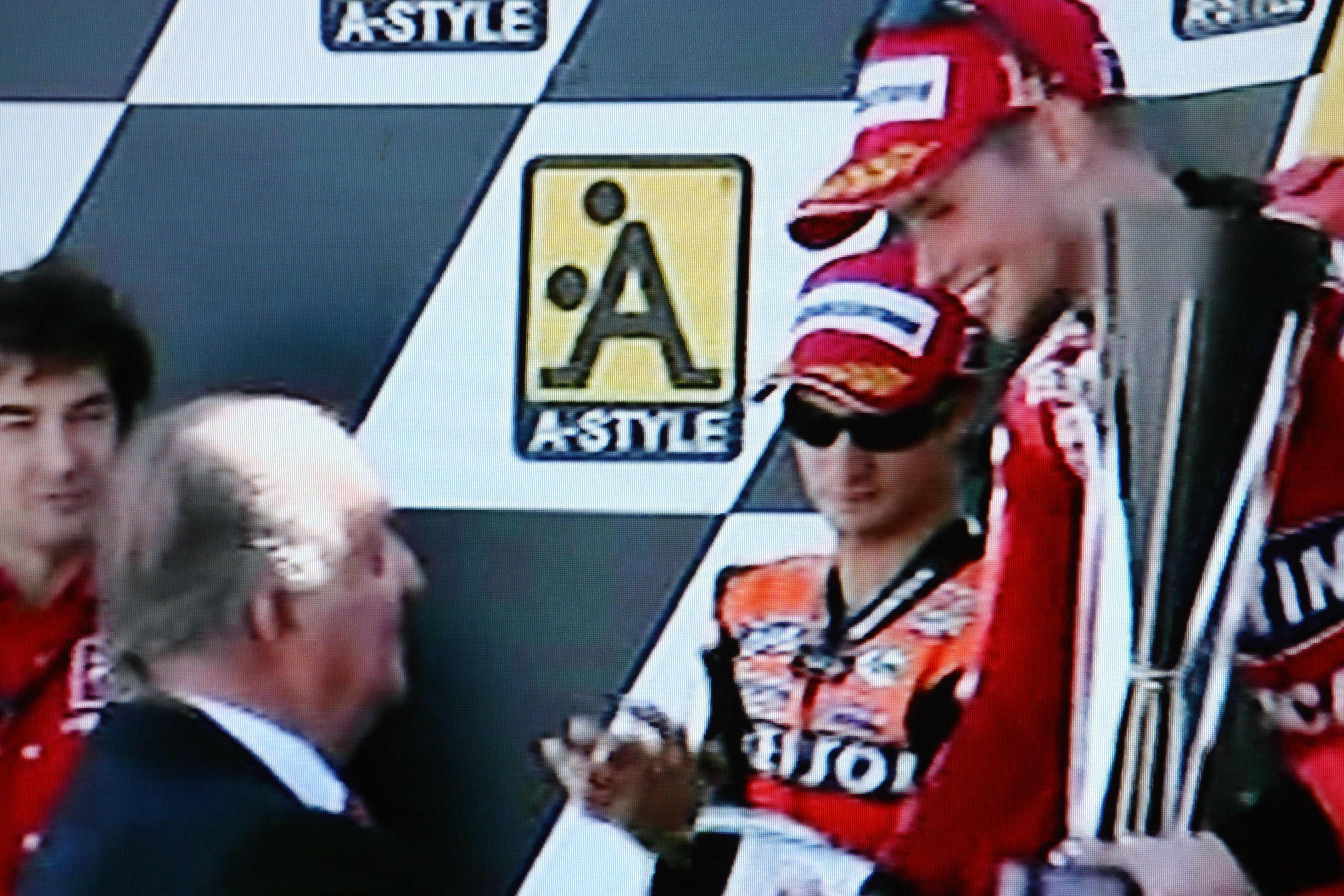 Closing note: The Spanish Aragon GP: King Juan Carlos presents winner Stoner with the trophy. Event sponsor’s logo given pride of place!