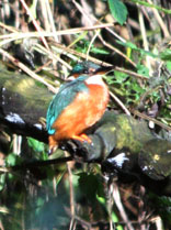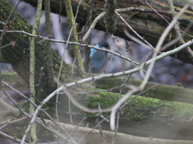 I resolved to bring my camera, which I did (oh how I rue the day!) There was a lot of activity that morning: I’d seen it two or three times – It had of course occurred to me that there could be more than one: a pair? I was on the verge of leaving when right out of the blue/turquoise/saphhire whatever you want to call it, close by the lower entrance to the park it landed on a branch overlooking a bend in the brook. It was about 70 yards away. Against all odds, which included a standard 50mm lens – no telephoto and uncontrollable shaking as I tried to focus (In fact, if the truth be known, I had a quite incomplete grasp of the procedures for focussing my Canon 450D for having had it for two months, I was too lazy to have read the instruction manual) The shot was an accident: I was pressing the button for a meter reading and overdid it. I got another one in, but with a shutter sound like a skoda car door slamming – that was it. The kingfisher was off!