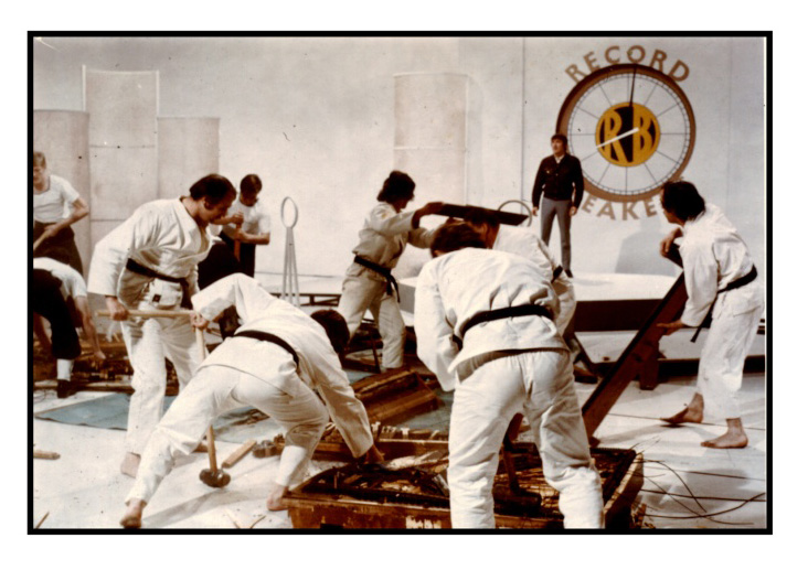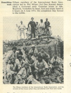The six-strong ‘Team Milner’s task was to smash a piano into fragments using only bare hands and feet. Then place the broken pieces through a nine-inch diameter hole. The world record at the time stood at two minutes 26 seconds. I am afraid to say, back then that along with my fellow walking in reverse stars, I took a rather dim view of the whole concept of ‘breaking’ which we regarded, rather highly and mightily as mere thuggery. But as we got to know the team during the course of the week, we warmed to them. I was lucky enough to watch the spectacle, and recall it as a thrilling, pretty brutal assault: but no more than that. Again, as so often been the case, I wasn’t really paying attention or looking hard enough. In fact Milner with five other members of the International Budo Association had made a previous unsuccessful attempt at the same record on the BBC children’s programme ‘The Record Breakers’ hosted by Roy Castle. However, on this occasion as well as the clock, they were up against a Royal Navy team equipped with tools, and their own piano to demolish. These, they did beat, if not the McWhirters’ stop watches. perhaps the team needed a little more to get their teeth into: like this 6 room early Victorian house at Idle, Bradford, Yorkshire which Milner and fifteen International Budo karate enthusiasts demolished by head, foot and empty hand in 6 hours on 4th June 1972! Once more The Guinness Book of Records was there to officiate.