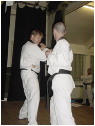My son and I stay to watch the remainder of the class and he is keen to give it a go, so I bring him down and he starts to train the following week. I accompany him to each lesson for the first few weeks; I guess to make sure that he is training safely and happily. I soon realise that this is not an issue at all as the instructors: Master Con and Fatima Halpin, Robin Bell, Alec Bryan as well as Neil give a high standard of tuition, which allows individual students to learn and progress in what can, sometimes be a busy class. However, I continue to accompany him long after I am satisfied he is settled, because I begin to be fascinated by the whole concept.