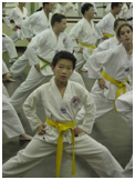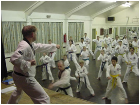‘Okay, sit down’ The instructor addresses his class, which consists of about 30 WTF (World Taekwondo Federation) students, ages roughly 7 to 13, of which nearly half are girls. The class members are each kitted out in uniforms which go through a whole spectrum of dirtiness and dishevellment from grubby grey to the crisp, smartest, whitest of whites. I notice that the majority wear a white, white and yellow or yellow belt, while alongside the instructor, standing to attention at the front of the class are a young man wearing a black belt and four older teenagers all of whom wear striped belts: two girls in green and blue and two boys in black and red.