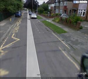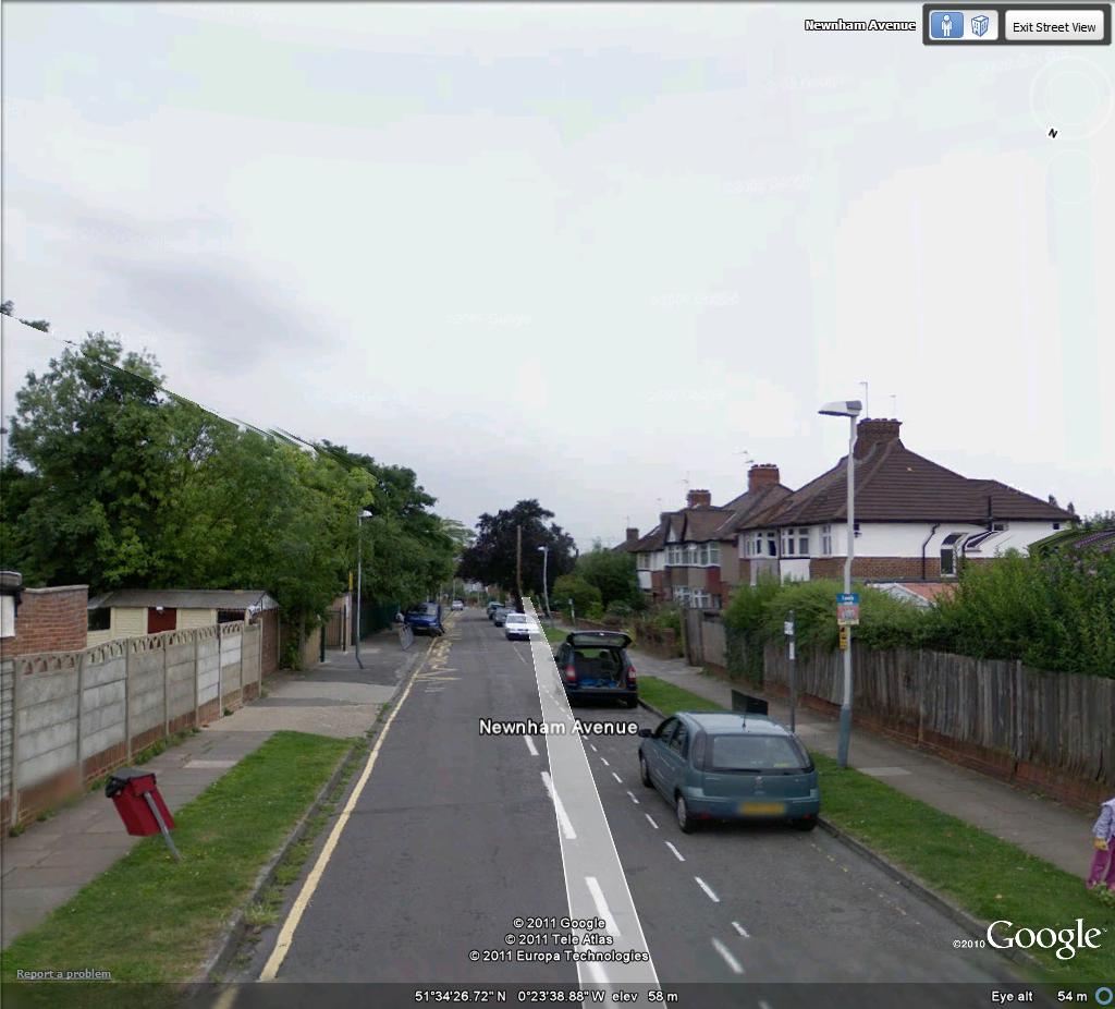We are headed along Sunningdale Avenue, about to turn right into Newnham Avenue. As we do – careful with that silver Volkswagen; he/she looks in a bit of a hurry. As we approach the junction with Newnham, taking care with the same Volkswagen we met a few seconds ago, and which seems to be going back in time (or doing a lot of reversing.)